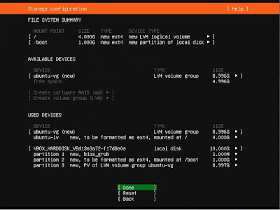 7. Kita bisa menggunakan “use an entire disk” untuk melakukan partisi hardisk secara otomatis dan setting disk sebagai LVM group untuk memudahkan penambahan kapasitas hardisk